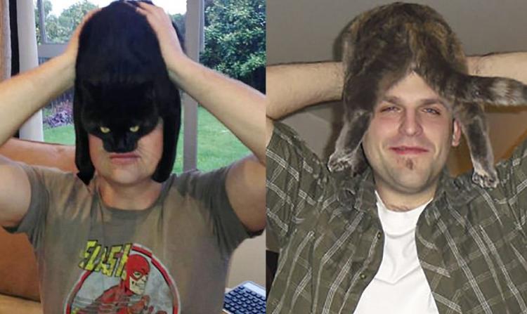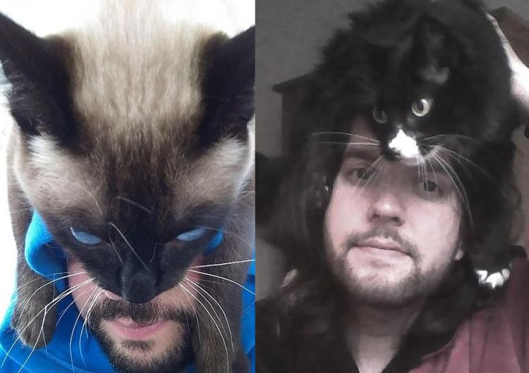 От мала до велика, от стара до млада, от.. какие там еще есть градации? А-а, не важно. Главное — наличие кота и чувства юмора. А задом наперед или передом назад вы будете втискивать его в кадр на своей буйной голове, дело десятое. Вопрос личного вкуса и творческой задумки.