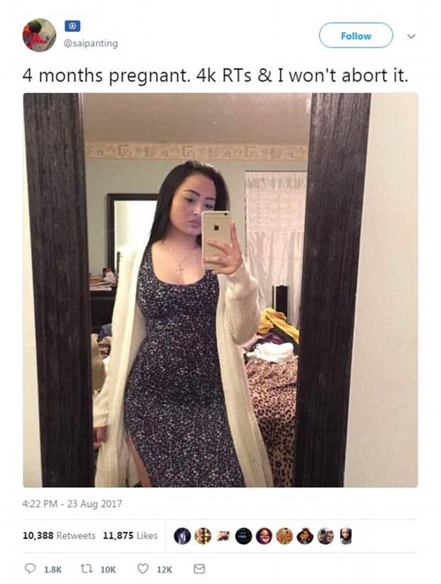 Некая молодая особа, скрывающаяся под ником Saipanting, задумала от души потроллить сообщество Твиттера. Девица опубликовала свое фото с округлившимся животом, заявила о четвертом месяце беременности и потребовала сделать не меньше 4000 ретвитов её сообщения.