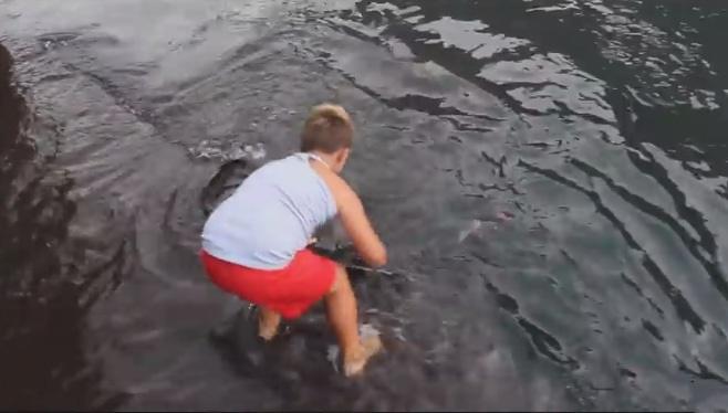 Из воды показался огромнейший скат. Несмотря на то, что скаты могут представлять большую опасность для человека, эта встреча с маленьким мальчиком закончилась благополучно!