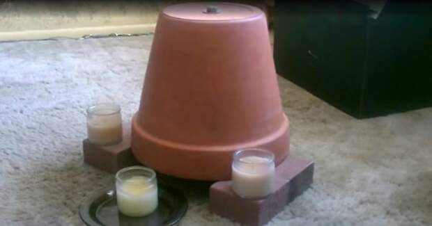 Чтобы сделать самому обогреватель воздуха тебе понадобится: 2 глиняных горшка для вазонов, длинный болт с двумя гайками и тремя шайбами, несколько кирпичей, 2-3 свечки и тарелка. Смотри, как это делает парень в видео!
