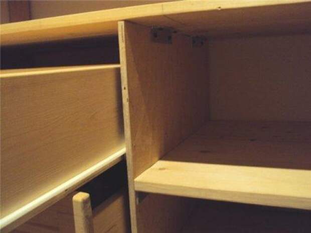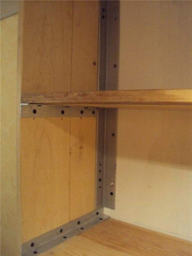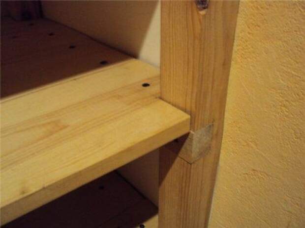 Нижние открытые полки крепятся с одной стороны к брускам, а с другой стороны к уголкам,прикрученным к фанере.