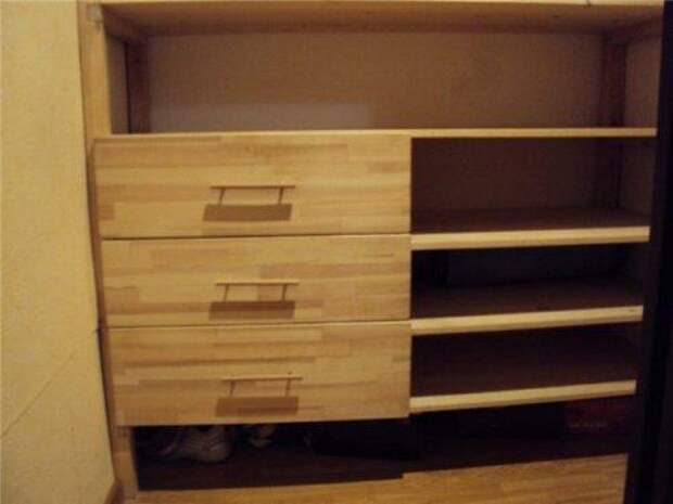 Далее, начиная снизу,на поперечные бруски укладываются доски. Сплошными делаем первую и четвертую полку снизу,а вторую и третью необходимо разделить посередине фанерой, чтобы в левой половине сделать выдвижные ящики, а правую оставить для открытых полок.