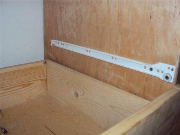Мебельный щит, вырезанный по размеру, крепится к наружной части ящика, а после этого крепятся выдвижной механизм и ручки.