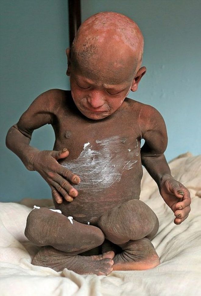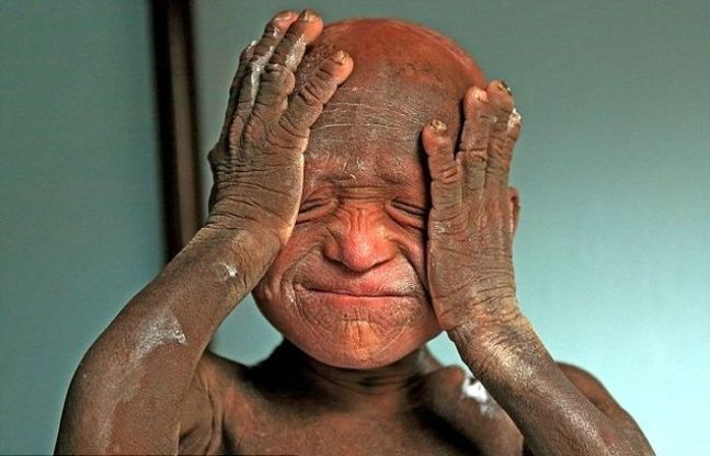 Кожа новорожденного стала твердеть, становиться черной. Все его тело начало покрываться странными чешуйчатыми наростами. Постепенно отвердевшая кожа стала лопаться и слазить с ребенка.