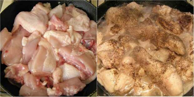 Куриное мясо нарежьте кусочками среднего размера, сложите в чугунок или толстостенную сковороду. Не добавляя никакого масла, накрыв крышкой, на слабом огне начните тушить курицу в собственном соку. Слегка посолите и поперчите. Процесс тушения займет 35–45 минут.
