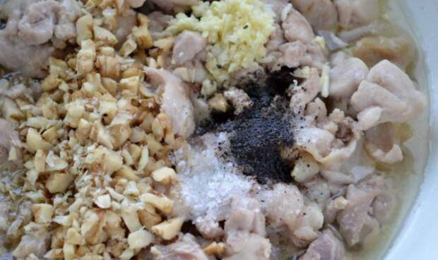 Добавьте к мясу орехи и пропущенный через пресс чеснок, подкорректируйте вкус, добавив соли и специй, влейте бульон с желатином. Оставьте остужаться.