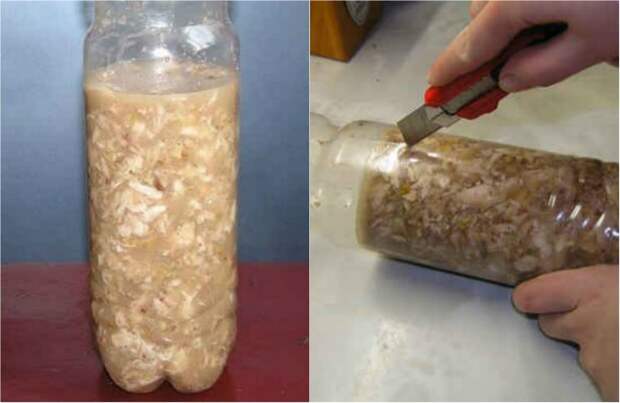 Возьмите чистую пластиковую бутылку, срежьте горлышко и наполните ее полностью остывшей смесью. Поставьте бутылку в холодильник на несколько часов (до полного застывания рулета). Когда рулет застынет, извлеките его, аккуратно разрезав бутылку.