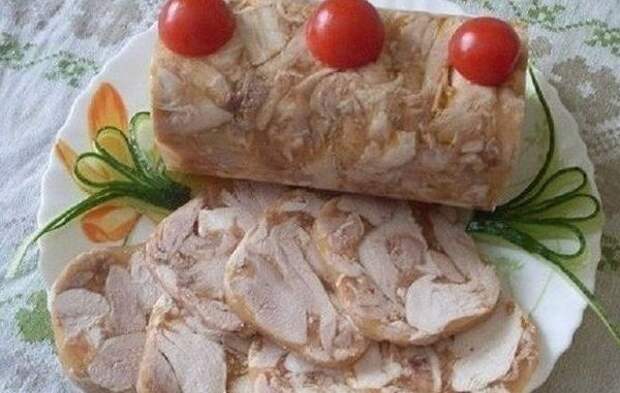 Поспешим поделиться рецептом вкуснейшей холодной закуски из курицы, которую можно позиционировать как рулет, сальтисон или зельц. Прекрасно впишется в праздничное меню, будет идеально смотреться на ломтике хлеба к завтраку: сытно, бюджетно и просто!
