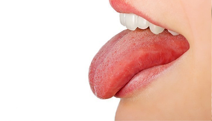 Здоровый человек — бледно-розовый язык, без налета, с ровной складкой, хорошо выраженными сосочками.