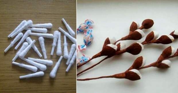 - Возьми ватные палочки. Для начала нужно подкрасить вату у основания коричневой акриловой краской, чтобы придать ей вид распускающейся почки.