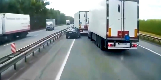 Дальнобойщики наказали автохама. Сразу понты пропали