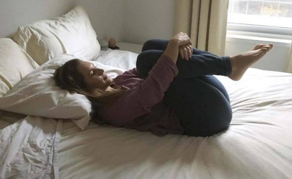 Положите руку на правой сторону туловища. Согните ноги в коленях и протяните их в противоположном направлении. Держите плечи на матрасе. Удерживайте тело в этом положении в течение 10 секунд, и перейти на другую сторону. Это упражнение повышает циркуляцию крови и работает на мышцы позвоночника. Делайте 5-7 повторений на каждую сторону.