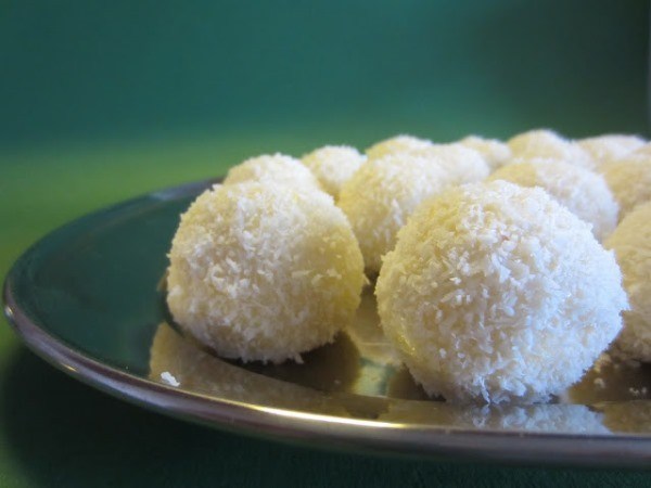 - Скатываем шарики размером примерно с грецкий орех, слегка смачиваем их водой (не обязательно), чтобы стружка лучше прилипла и обваливаем в кокосовой стружке.