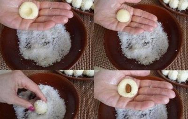 - Отщипываем небольшие кусочки от охлажденной кокосовой массы, приминаем их руками и в серединку лепешки помещаем миндаль.