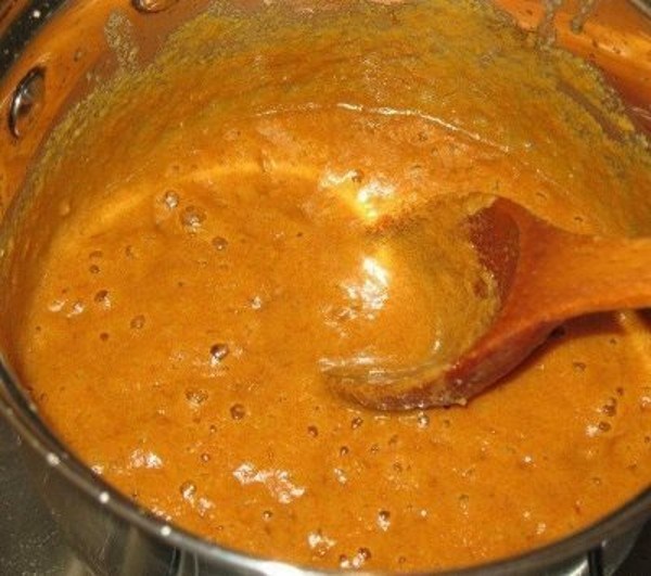- Варить на среднем огне примерно 30 минут, постоянно помешивая. Готовая масса должна быть густой, с ярким карамельным цветом.