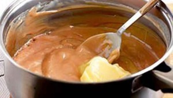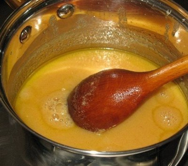 - Когда вас устроит цвет ирисок, снимите их с огня и добавьте сливочное масло. Масло нужно интенсивно вмешать с состав.