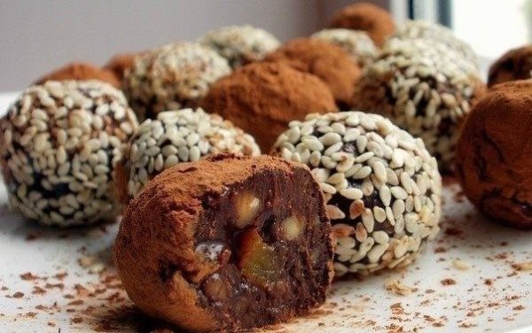 - Из полученной массы скатать маленькие шарики, опять охладить, обвалять в какао и кунжуте.