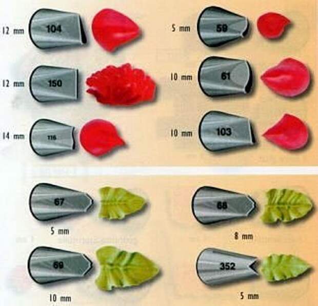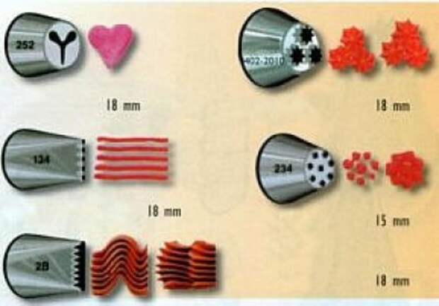 Меньше 3 см не удобные в работе. Есть большие насадки в 5 см, из них получаются красивые узоры на тортах и замечательные безе.Ниже приведу примеры шапочек разными насадками.