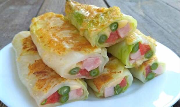 В оригинале все ингредиенты начинки нарезаются длинной толстой соломкой. Трубочки очень эстетично выглядят на срезе и идеально подходят для детей: полезно и ничего не выпадает во время еды.