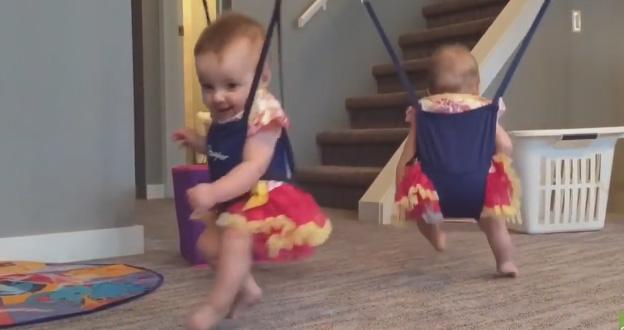 Двух близняшек мама подвесила на ходунках. Но дождитесь, пока играет музыка!