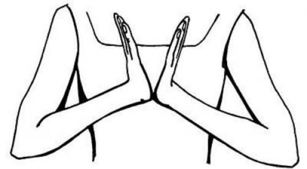 Мизинец правой руки согните так, чтобы он прикасался к основанию большого пальца, которым слегка прижмите его. Левой рукой обхватите правую кисть снизу так, чтобы большой палец левой руки находился на большом пальце правой.