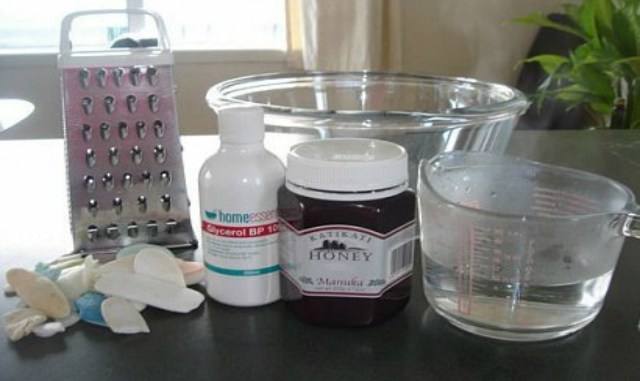 1. Трем мыло на терке в миску и наливаем туда кипящую воду. Взбиваем все это блендером.