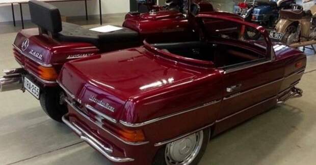 Этот необычный мотоцикл, стилизованный под автомобиль Mercedes-Benz E-Class W123, находится в одном из музеев Финляндии. При строительстве мотоцикла с коляской использовали кузовные детали W123, его колеса и, судя по шильдику в задней части, даже 2,4-литровый дизельный двигатель. В описании говорится, что создатели черпали вдохновение из мотоциклов Boss Hoss.