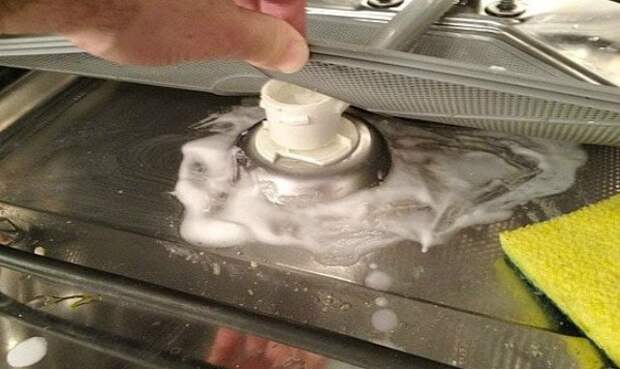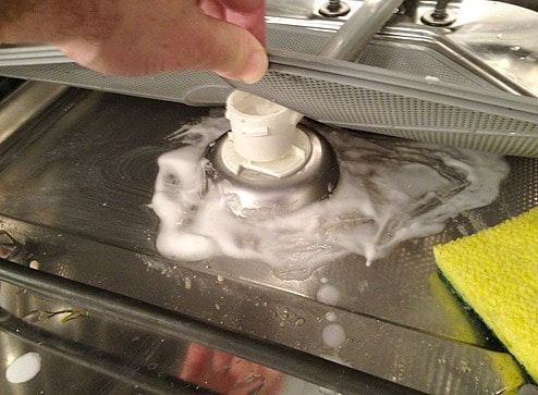 Не только сам фильтр, но и то место в котором он размещен, забивается мусором. Обязательно поднимайте решетку и избавляйте недоступные места от остатков пищи. Если вы раньше не заглядывали туда, очень удивитесь тому, сколько грязи скапливается на дне машинки. Почистите всю поверхность кашицей из соды и уксуса, и оставьте смесь на 20 минут. Протрите все детали чистой губкой. Если остались пятна, повторите процедуру еще раз.