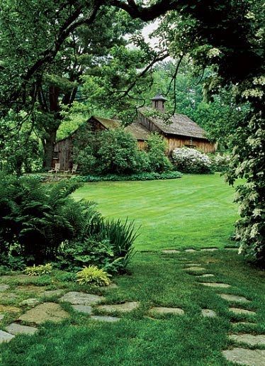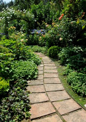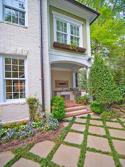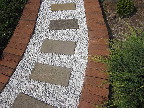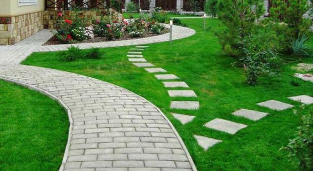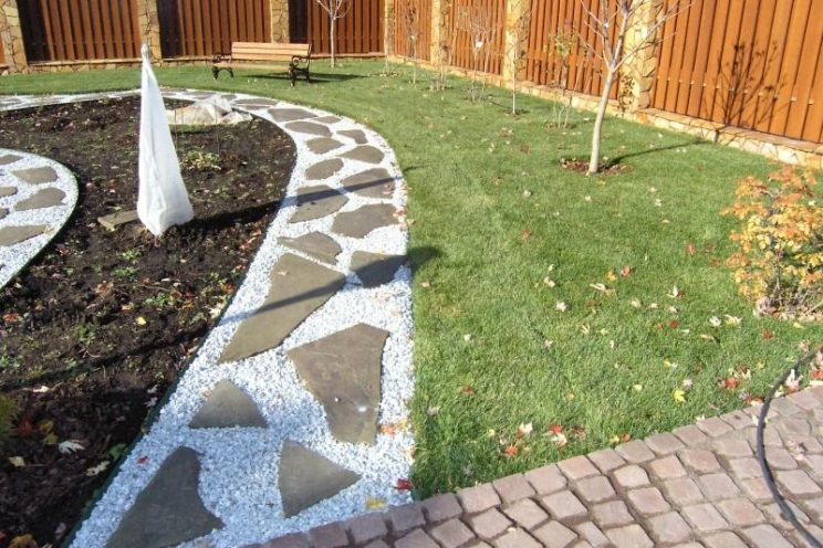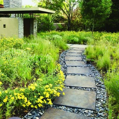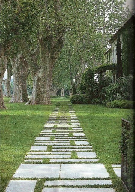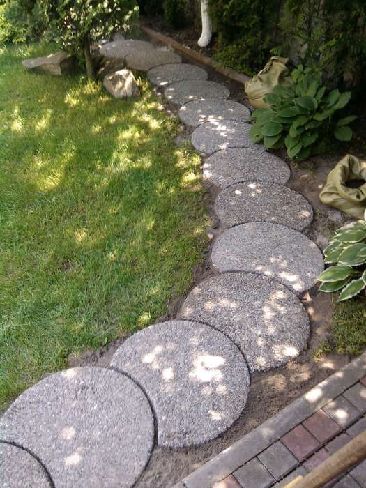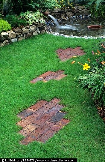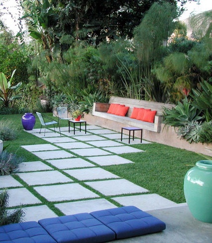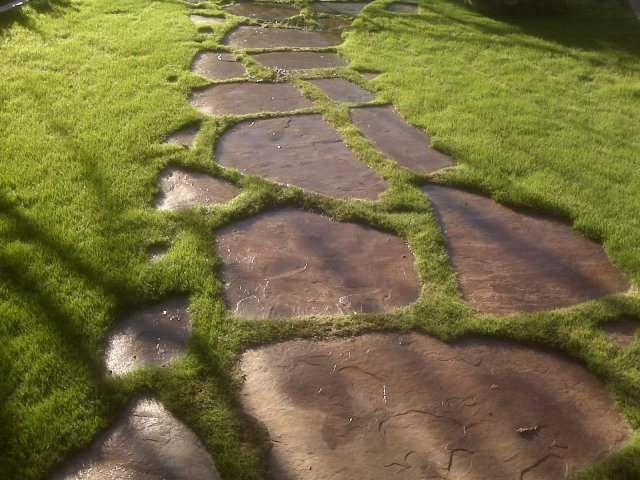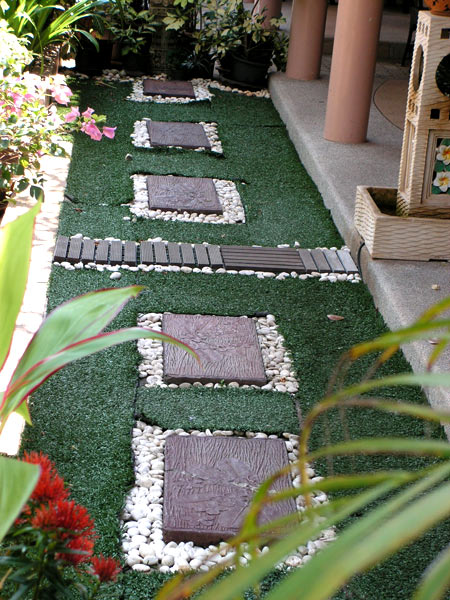 Интересная идея по дизайну садовых дорожек встретилась мне во дворе одного из заграничных ресортов. Это искусственный рулонный газон, в котором вырезаны квадратные отверстия под плитку. Отверстия больше плитки по размеру и потому вокруг плитки 30 х30 см засыпана белая галька. Можно сделать такие дорожки и в комбинации с настоящим газоном.